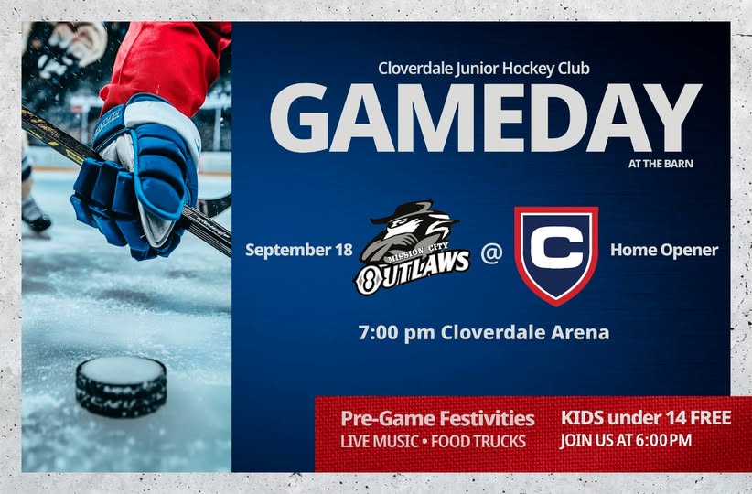 The first regular season game is scheduled for the Cloverdale Jr. Hockey Club at “The Barn” or the old (still in use) Cloverdale Arena at 7 p.m. Sept. 18th as they host the visiting Mission City Outlaws.
